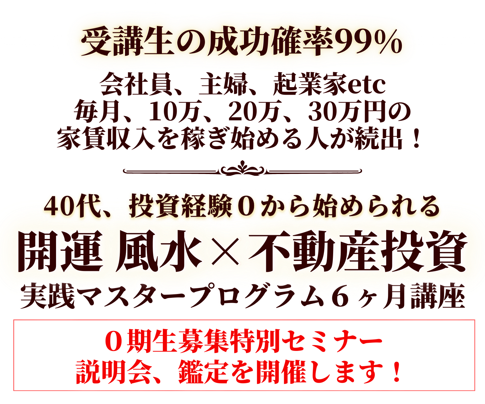 | 【開催時間】 | セミナー&説明会は開催時間は2時間です。 その後、希望者は個別相談会を1時間程度を予定しております。 |